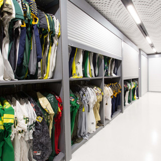 A recent example is at the new Jane Sanders Stadium at the University of Oregon. In addition to a new ballpark, practice area, locker rooms, and a player lounge, the stadium also boasts a state-of-the-art equipment room. With laundry facilities, work areas, and a Spacesaver compact mobile storage system, the equipment room demonstrates how form and function can combine to boost team spirit and store large amounts of athletic gear.